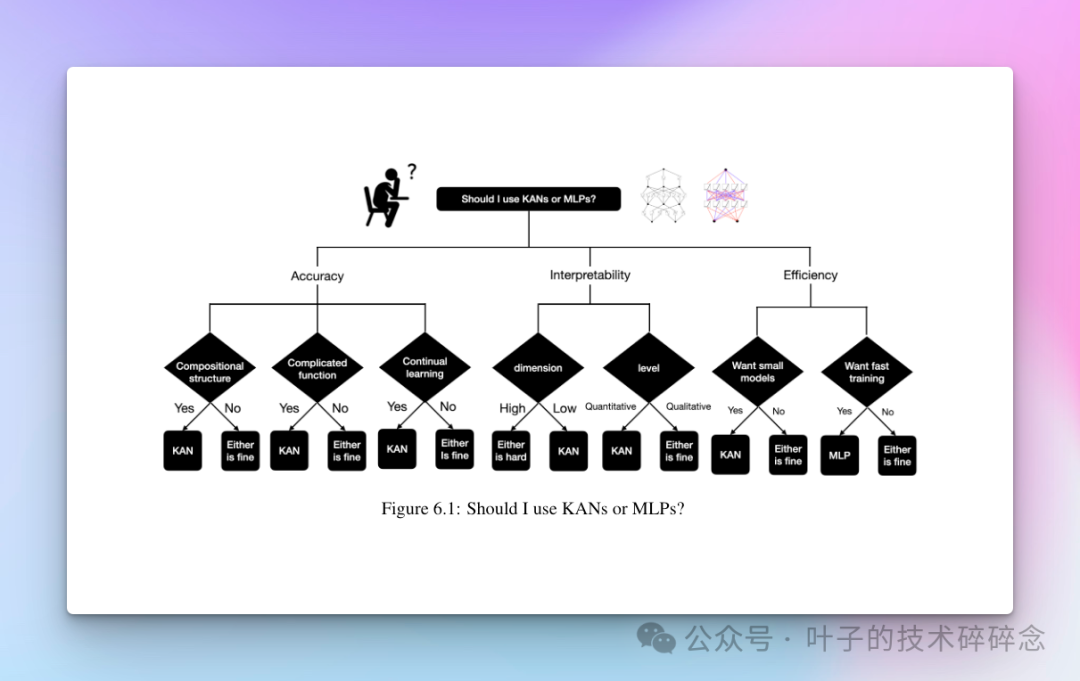 文中给出了一张决策树告诉我们如何进行选择,分别从准确性、可解释性以及效率这3个维度来判断如何进行选择,因为目前 KANs 的最大问题在于训练速度较慢,相同数量的参数情况下,KANs 通常比 MLPs 慢 10 倍。作者的观点认为 KANs 的训练速度慢只是个工程问题,不是根本性的限制。如果训练缓慢不是主要问题,建议可以尝试下KANs。