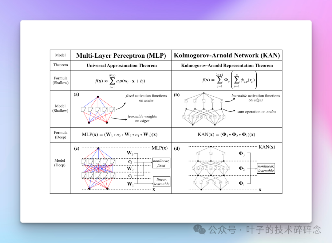 再然后文中也对 UAT(Universal Approximation Theorem) 和 KAT(Kolmogorov-Arnold Theorem)进行了对比: