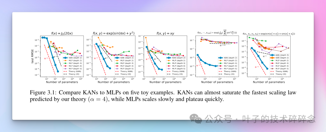 KAN理论提出,由于其结构允许将高维函数有效地分解为多个一维函数,因此能够在参数效率方面实现更好的缩放律。这是因为KAN不仅能够学习函数的组成结构(外部自由度),还能精确地近似这些一维函数(内部自由度),从而在相对较少的参数下实现高精度的函数近似。特别是,在高维函数的情况下,KAN表现出比MLP更好的缩放行为和泛化能力。