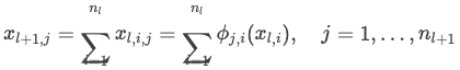 描述了如何在第 l 层和第 l+1 层之间进行计算,即下一层的每个节点的激活值是当前层所有节点输出通过相应的一维函数处理后的总和。