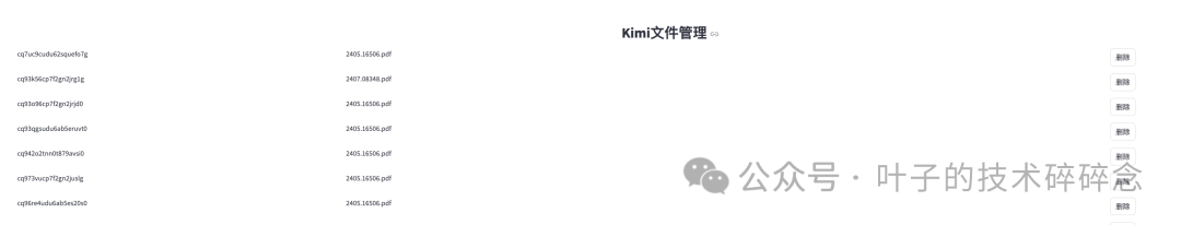 对pdf的读写是依赖于kimi的基于文件的问答,因此会上传文件到kimi,文件上传列表可以在设置页面看到(初版暂时没做文件上传去重处理),不需要的可以删除。文件本身也会下载到data目录,每篇论文对应一个文件夹,里面存放pdf以及数据json,避免每次都要重新调用接口。