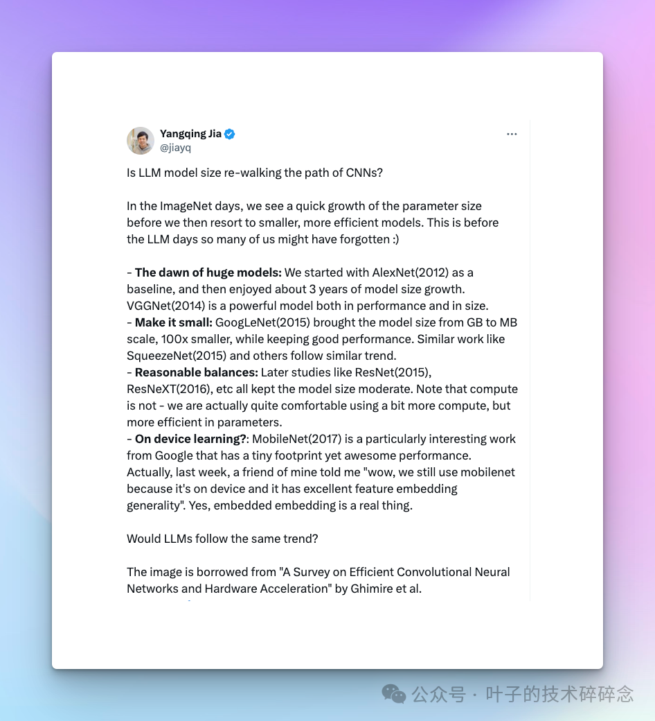 虽然想要真正的进行模型商业使用,如果不使用模型产商的api而是进行私有的训练或部署,小体量的模型很难上战场,大体量的又承担不了成本。可未来会一直维持这样的尴尬境地么?我想不会,正如最近贾扬清说的 Is LLM model size re-walking the path of CNNs? 以及 Karpathy 说的 LLM model size competition is intensifying… backwards!,未来大模型的发展可能会逐渐变成尺寸越来越小的模型,而硬件的发展也有着黄仁勋的黄氏定律(虽然咱国内不一定能用上最强版本),因此对于大模型行业,资源成本应该是逐步降低的趋势的。