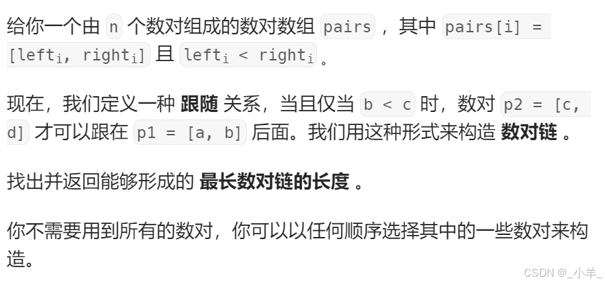 定义状态 dp[i] 表示以i位置元素为结尾的所有数对列中的最长长度,对于dp[i] ,遍历所有[0, i - 1] 区间内数对用j 表示下标,找出所有满足pairs[j][1] < pairs[i][0] 的j ,找出其中最大的dp[j] ,然后加上1 ,就是以i 位置为结尾的最长数对链。