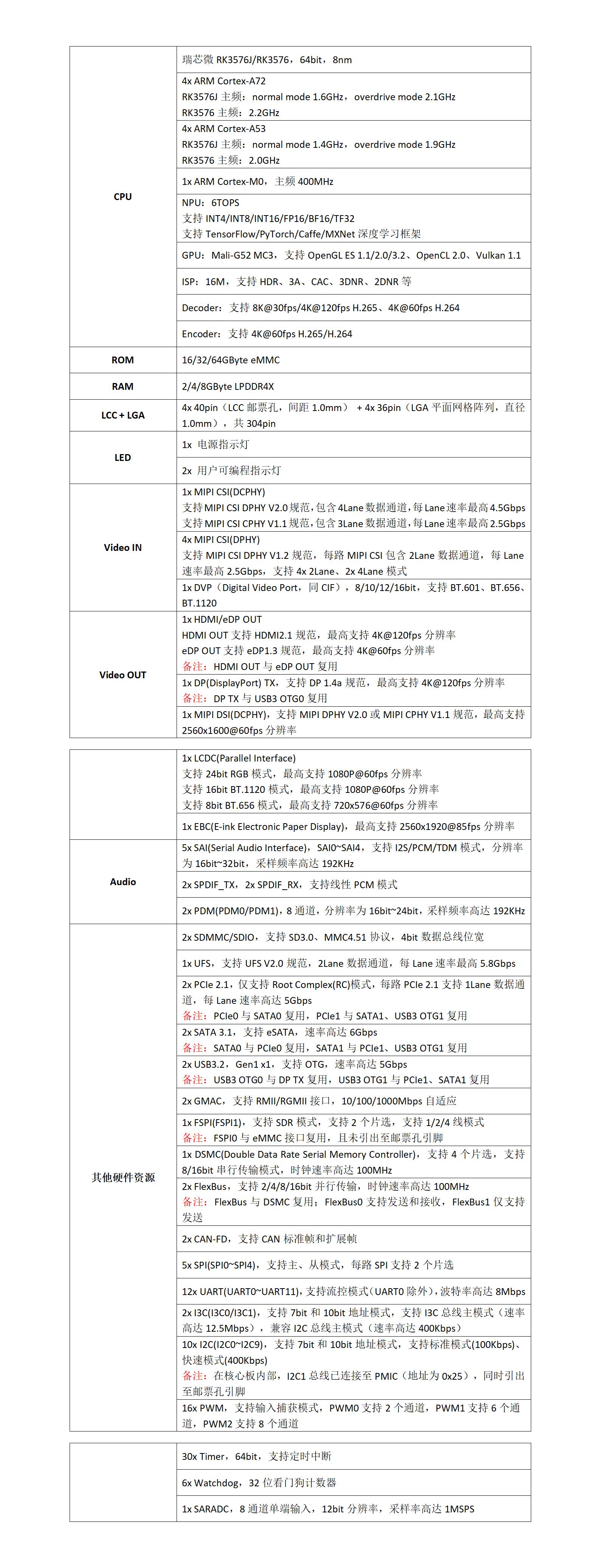 核心板通过邮票孔(LCC) + LGA连接方式引出2x GMAC、2x USB3.2、2x SATA 3.1、2x PCIe 2.1、2x SDMMC、2x CAN-FD、5x MIPI CSI、MIPI DSI、HDMI/eDP OUT、DP Display、RGB Display等接口,内置6TOPS NPU、Mali-G52 MC3 GPU、16M ISP,支持三屏异显、4K@60fps H.265/H.264视频编码、8K@30fps H.265/4K@60fps H.264视频解码,并支持UFS大容量存储器件。核心板经过专业的PCB Layout和高低温测试验证,支持选配屏蔽罩,质量稳定可靠,可满足各种工业应用环境要求。