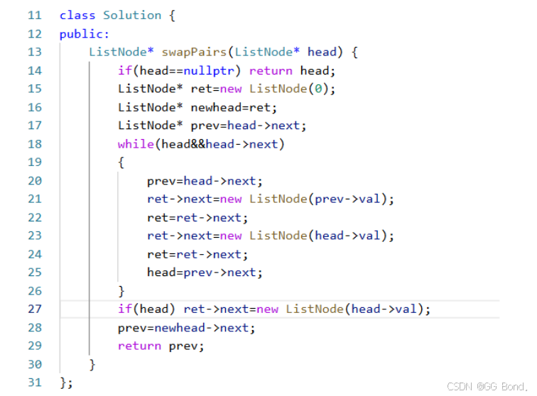 这种解法就比较简单粗暴了,就是直接创建一个全新的链表,将原链表中的值按要求交换后输入这个链表中,这样做的好处就是思路简单,容易想到,缺点就是空间开销大