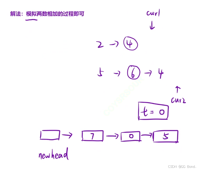 我们可以结合代码来看一下这个原理图,首先我们需要定义一个整数t,它的作用就是计算链表同一位置两数的和,其实对应的就是加法中的相同权值的位置相加(比如个位+个位),然后将t的个位放入求和链表中的相同位置,t如果十位不为0,代表的其实是要进位,比如上面例子中4+6=10,那么个位是0,我们将0放入求和链表的第二个节点处,t的十位跟随cur1、cur2一起来到权值更高的下一个节点进行新的相加运算
