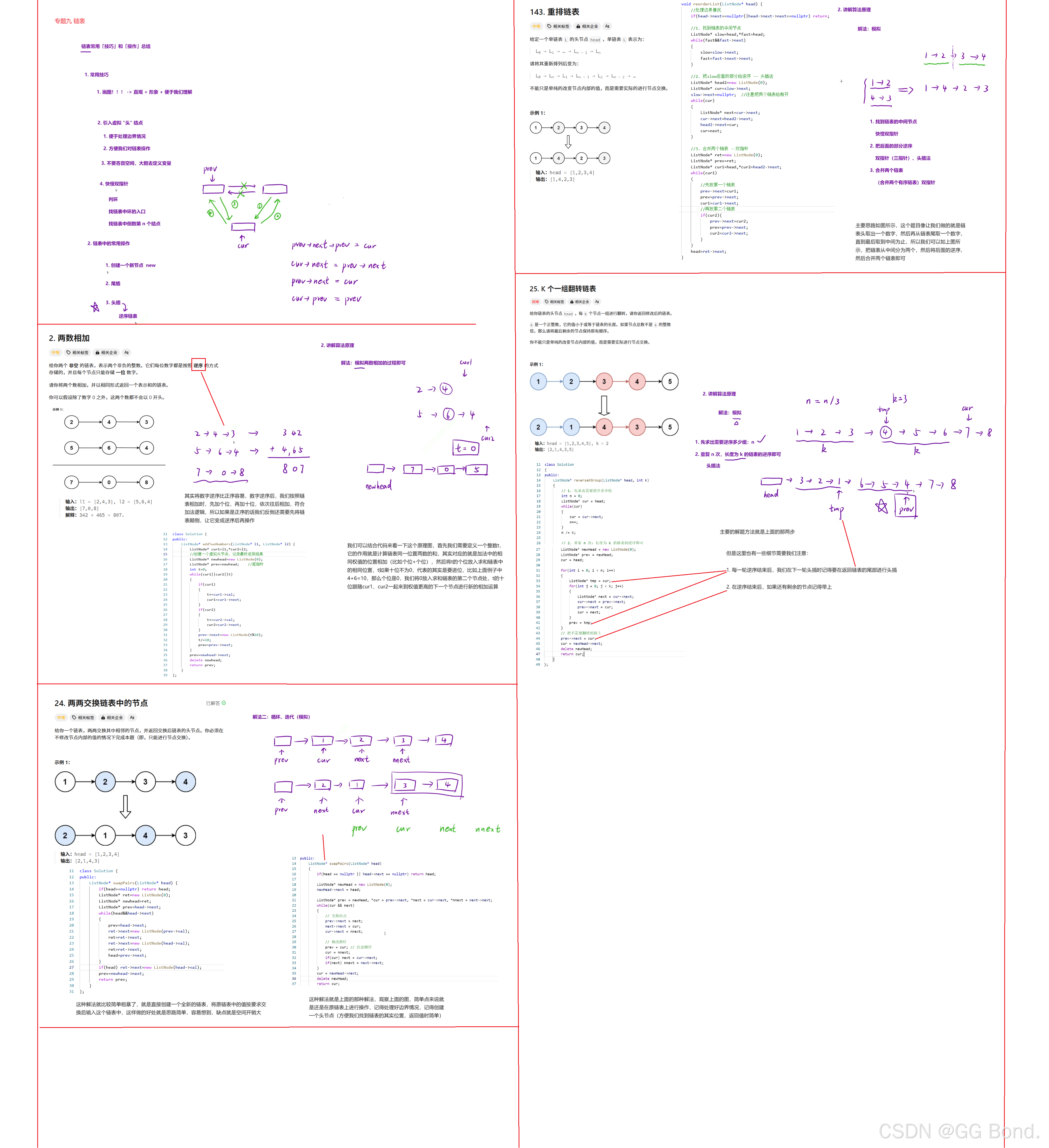 };以上就是几个经典的链表的例题,通过这几道题,其实我们应该明白的是,要想做好链表相关的题,就一定要把有关链表的基础算法给掌握好,比如如何逆序链表,如何实现头插尾插,如何使用快慢双指针等,把这些基础算法掌握好,然后结合题意,大部分链表题还是能够拿下的