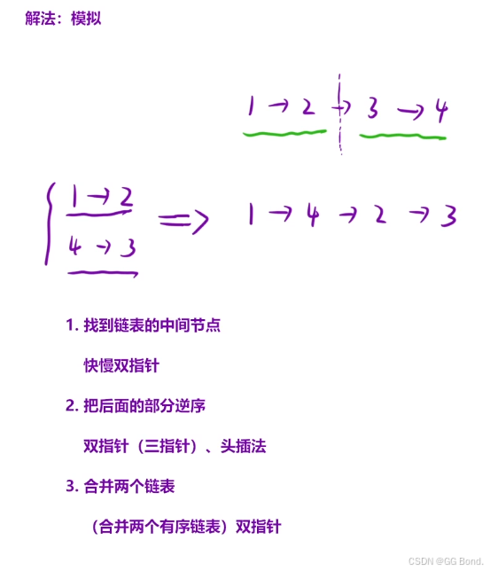 主要思路如图所示,这个题目像让我们做的就是链表头取出一个数字,然后再从链表尾取一个数字直到最后取到中间为止,所以我们可以如上图所示,把链表从中间分为两个,然后将后面的逆序然后合并两个链表即可