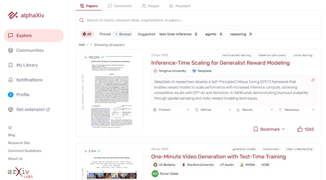 平台支持研究人员、学生和爱好者之间的互动交流,部分作者会亲自回复评论。用户可通过「Trending」页面查看当前讨论最活跃的论文,或使用「Talk to Authors」功能筛选出作者参与讨论的论文。