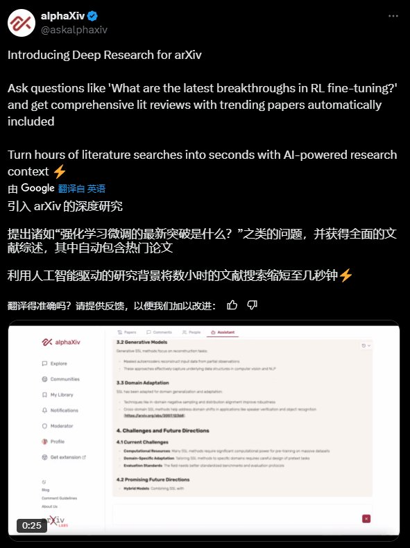 刚刚,alphaXiv 推出了新功能「Deep Research for arXiv」,该功能可协助研究人员更高效地在 arXiv 平台上进行学术论文的检索与阅读,显著提升文献检索及研究效率。