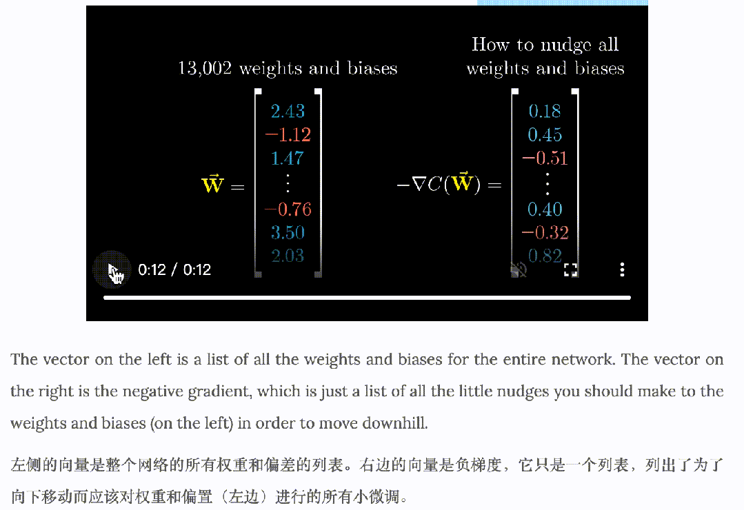 想象将整个网络的所有权重(weights)和偏置(biases)组织成一个包含13,002个条目的大型列向量。此时,损失函数的负梯度(the negative gradient)也将是一个包含13,002个条目的向量。