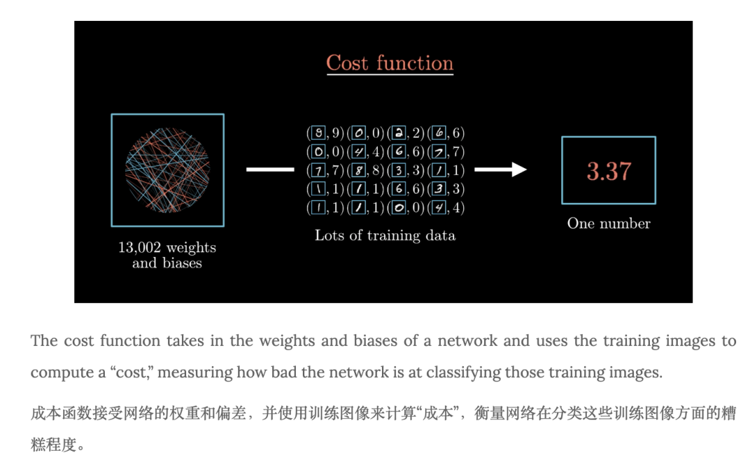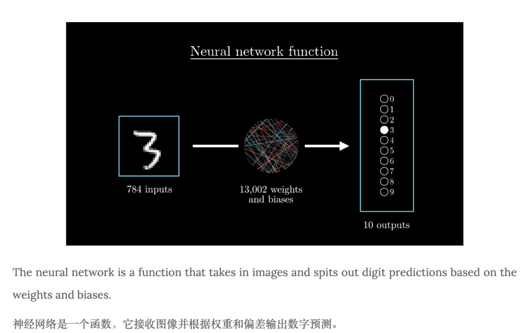 考虑到每层有16个神经元的两层隐藏层的选择,这个网络总共有13,002个可以调整的权重和偏置,正是这些值决定了网络的具体功能。