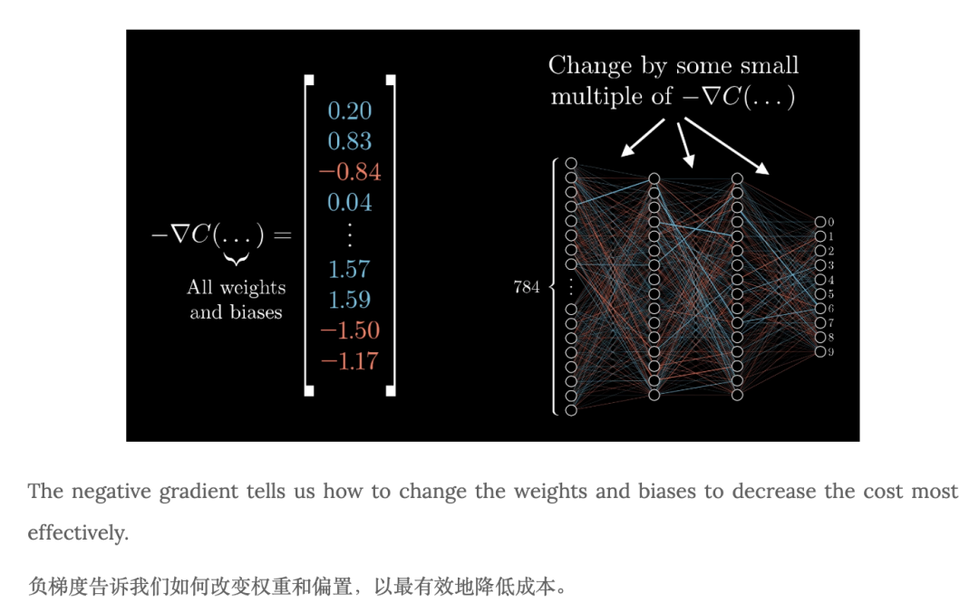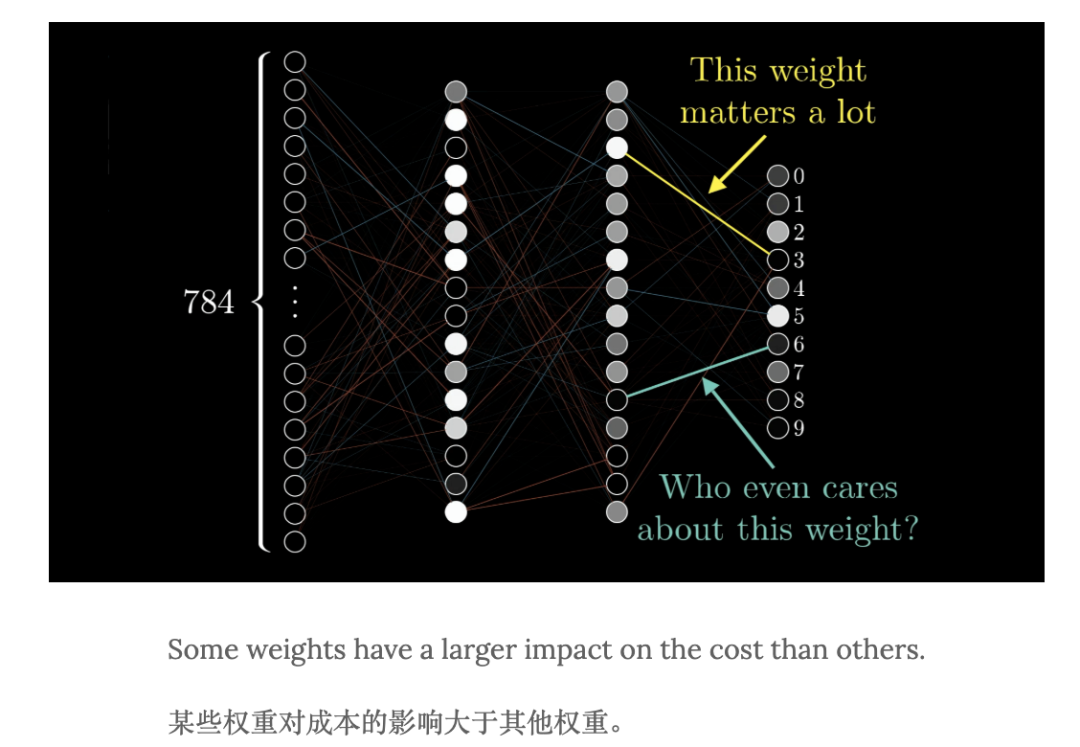在我们的网络中,某些连接比其他连接对训练数据的影响更大。你可以将我们庞大的损失函数的梯度理解为,它编码了每个权重和偏置的相对重要性。也就是说,哪些变化能带来最大的效益。