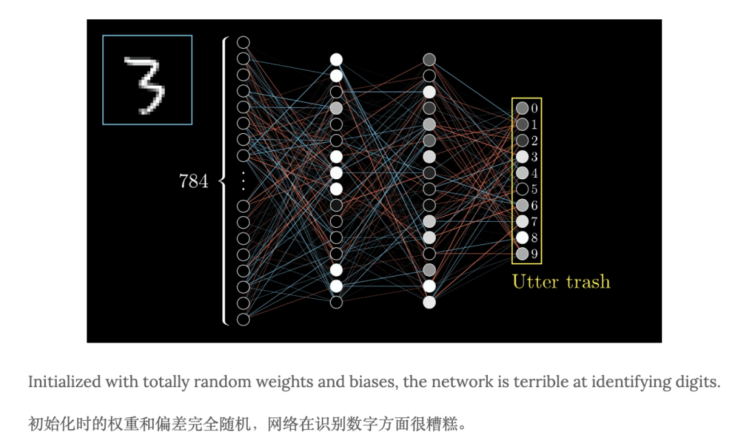 一开始,将所有的权重和偏置初始化为随机数。由于网络此时的行为是随机的,所以在给定的训练示例上表现会非常糟糕。