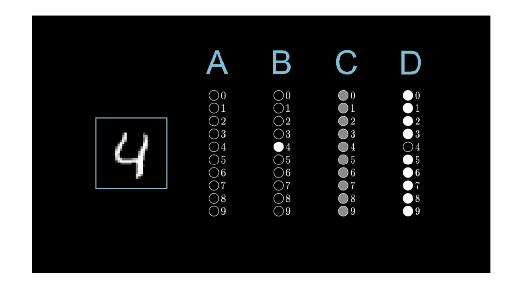 我们设计这种分层结构的初衷是:或许第二层可以检测边缘,第三层可以识别诸如环和线之类的图案,而最后一层则将这些图案组合起来以识别数字: