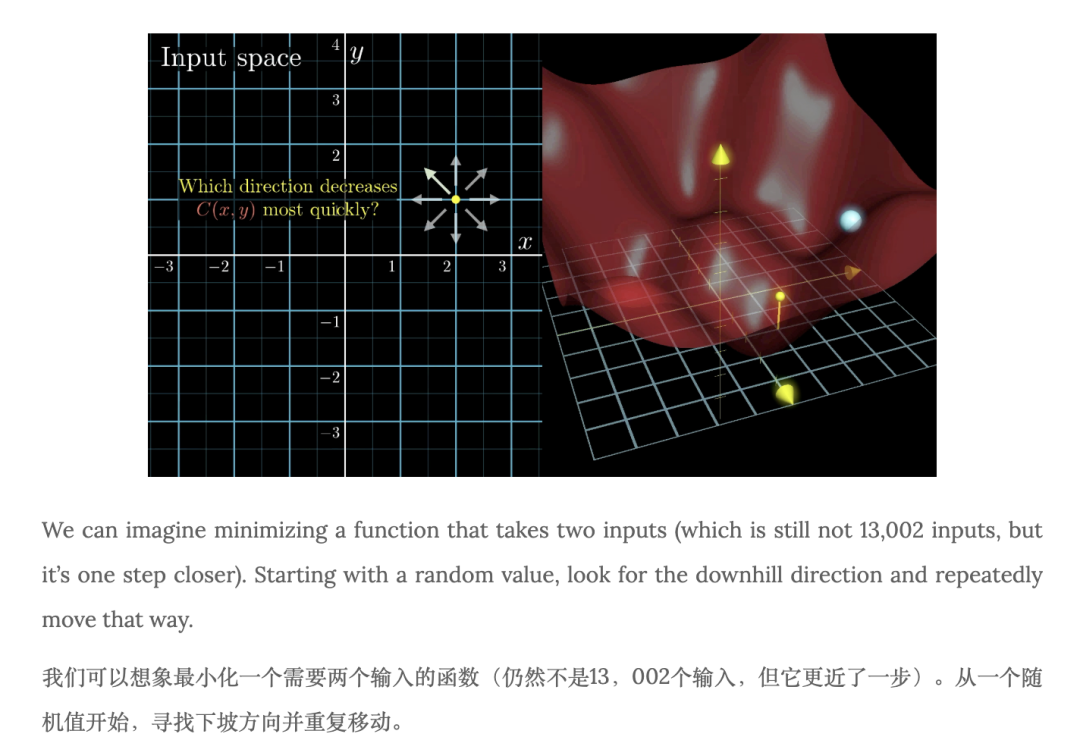 对于那些不熟悉多变量微积分的人来说,可以查看我在可汗学院(Khan Academy)(https://www.khanacademy.org/math/multivariable-calculus)关于这个主题的一些工作。不过说真的?对于我们目前的需求而言,重要的是在理论上存在一种方法可以计算这个向量,它既能告诉你“下坡”的方向,也能告诉你坡度有多陡。即使你对细节不太清楚,也没关系。