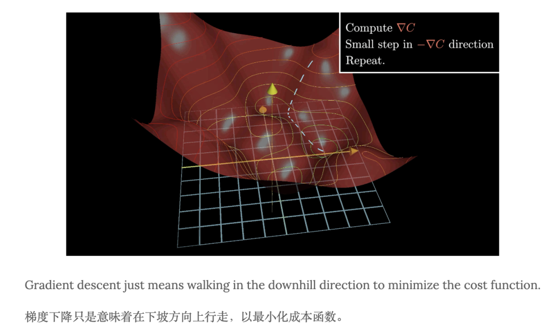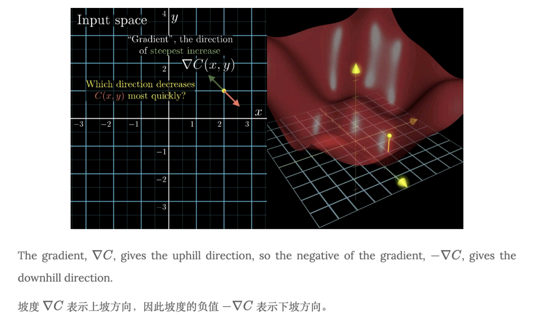 很自然地,取这个向量的负方向就得到了最快降低函数值的方向。此外,梯度向量的长度表示这个最陡峭斜坡的坡度有多陡。