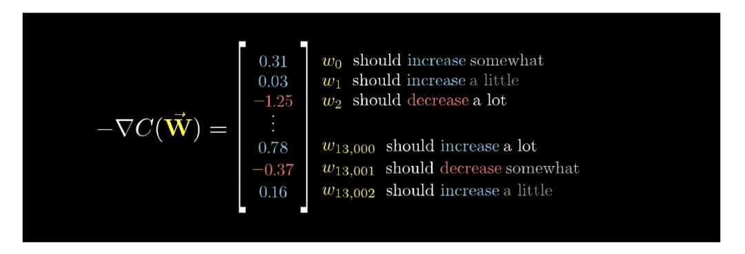 负梯度向量的每个分量告诉我们两件事。首先,符号当然告诉我们输入向量的对应分量应该向上还是向下调整。但更重要的是,这个梯度中各分量的相对大小告诉我们哪些变化更重要。