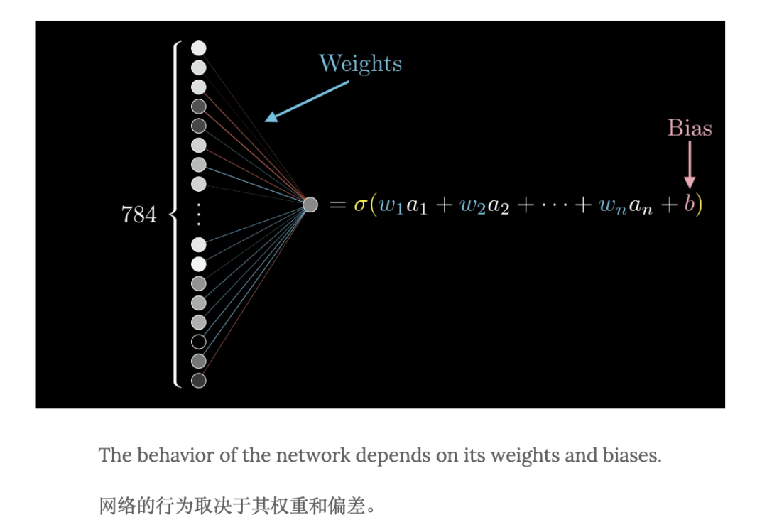 记住,我们网络的行为由其所有的权重和偏置(weights and biases)决定。权重表示一层中每个神经元与下一层中每个神经元之间连接的强度。而每个偏置则表明其对应的神经元倾向于活跃还是不活跃。