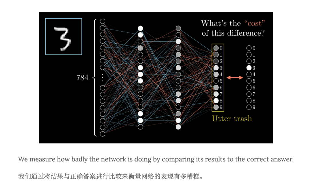 为此,你需要定义一个损失函数(a cost function),这相当于告诉计算机:“不,表现糟糕,输出层的激活值应该大多数接近0,而第三个神经元的激活值应为1。你给我的结果完全是垃圾!”