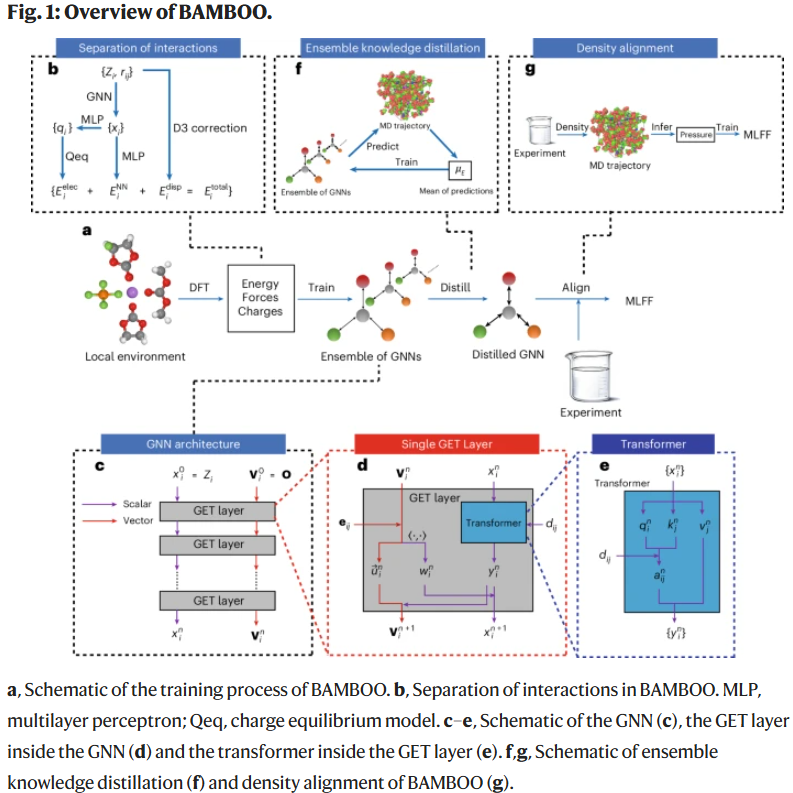 图1b描述了BAMBOO在能量计算中对半局域、静电和色散相互作用的拆分方式。模型输入为原子类型和三维坐标。半局域能量由包含GET层的GNN负责建模;静电能量通过预测原子部分电荷并结合电荷平衡方法计算;色散能量则基于DFT-D3修正直接获得。最终,总能量由三类能量项相加得到,力的计算满足牛顿第三定律。
