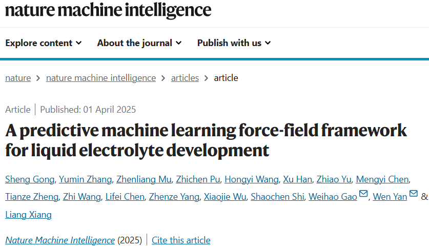 Gong, S., Zhang, Y., Mu, Z. et al. A predictive machine learning force-field framework for liquid electrolyte development. Nat Mach Intell (2025).