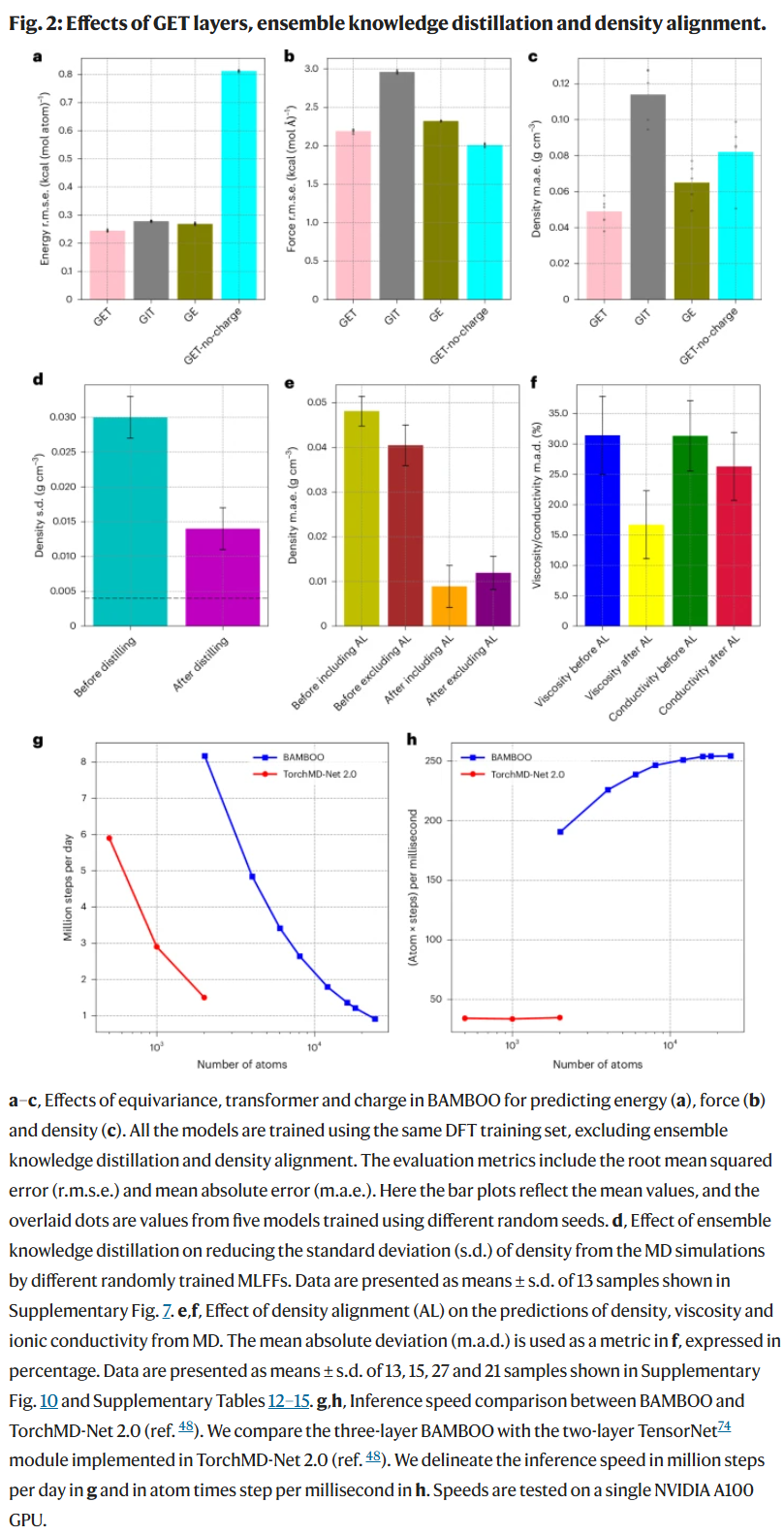 图1f展示了BAMBOO所采用的“集成知识蒸馏”策略,旨在应对机器学习中的随机性对分子动力学(MD)模拟结果带来的波动问题。研究人员发现,即便多个图神经网络(GNN)在验证集上表现相近,其所生成的宏观性质(如密度)在模拟中仍存在显著差异。这主要源于两方面:一是MD本身具随机性,二是在液体电解质建模中,模型需从训练阶段的气相簇推广至实际的液相体系,存在明显的“域外预测”问题,增加了模型行为的不确定性。