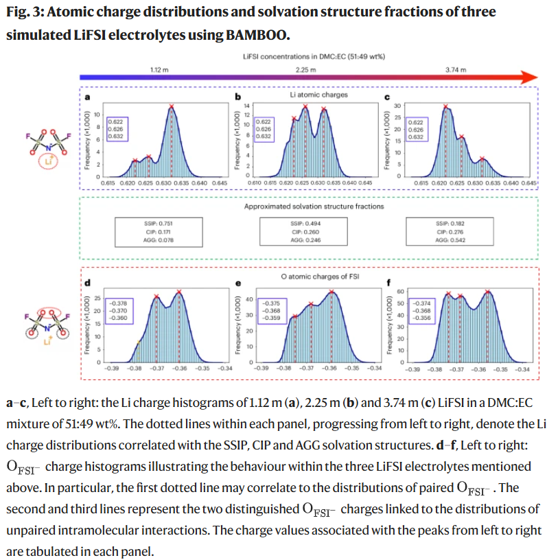 图3展示了在不同浓度(1.12 m 至 3.74 m)LiFSI 电解质中的Li⁺和FSI⁻原子电荷分布直方图。三种电解质体系中,溶剂DMC与EC的质量比均保持为51:49。Li⁺电荷分布在所有浓度下都呈现出三个主峰,位置分别约为0.622、0.626与0.632,随着盐浓度升高,最显著的主峰从高电荷区逐渐向低电荷区移动,说明Li⁺所处的局部环境在不断发生变化。