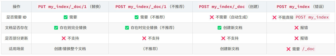 POST 传入了指定 ID,但 POST 的默认行为是创建新文档,不适用于替换已有文档,可能会导致数据不一致。因此,替换文档应使用 PUT,部分更新应使用 _update。