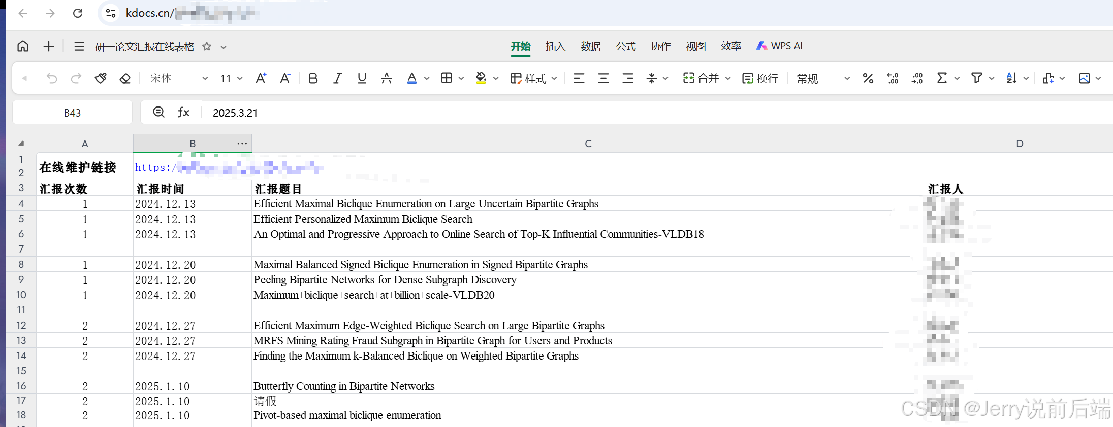 但是,这样存在一个问题,因为要求每个人汇报的论文不一样,所以我想着要不要搭一个类似于小绿鲸那种文件管理工具,但是思来想去涉及到的开发成本有些高,于是重新分析,既然是论文题目不一致,那么可以收集论文题目,然后放在一个文件里面,每次都可以搜一下自己的论文是否已经被其他人汇报过了。对于文件的更新,由所有人去维护。于是想到了使用 WPS 在线文档: