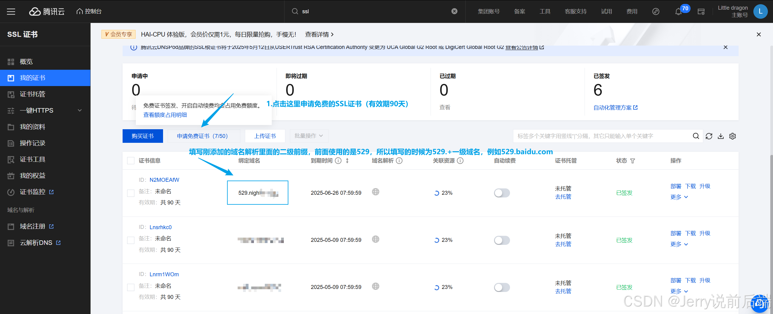 为了节省域名费用,这里可以采用免费试用的90天域名证书(到时间之后再重新申请一个),然后配置一个二级域名映射: