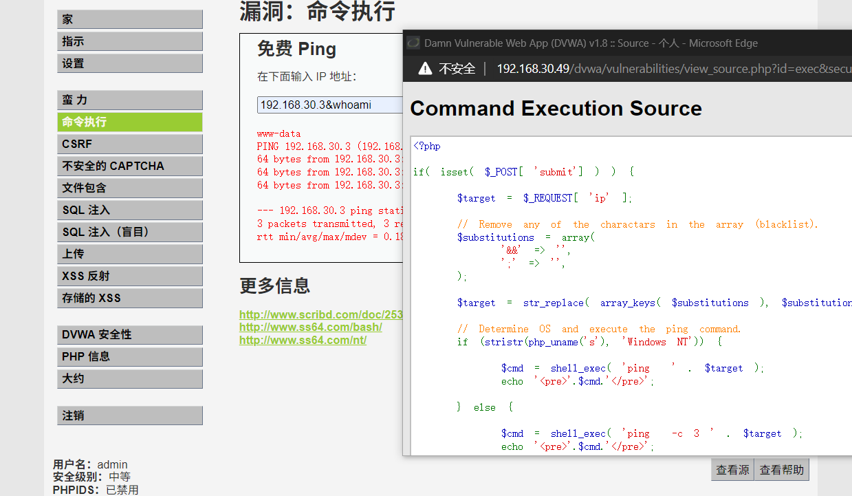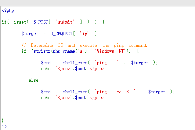 因为是简单难度,所以呢,逻辑也很清晰。用户给一个ip然后直接放到CMD里面执行了。整体下来也没有什么防御措施,所以呢这个命令注入特别明显。