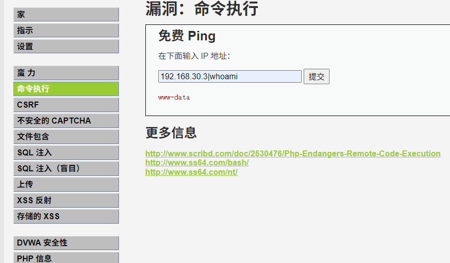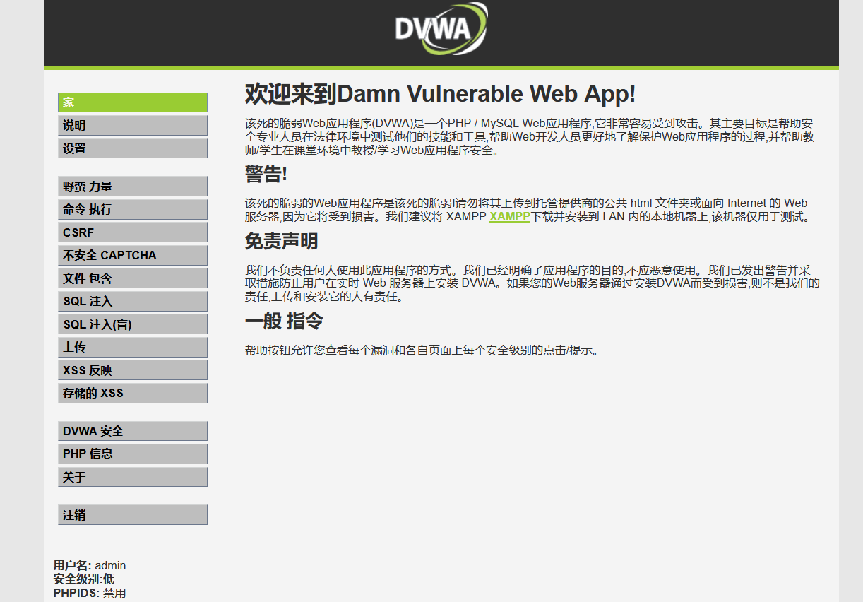 DVWA的内容也挺丰富的。暴力,命令注入,跨站,验证码绕过,文件包含,sql注入,盲注,文件上传漏洞,xss漏洞,存储型xss漏洞。