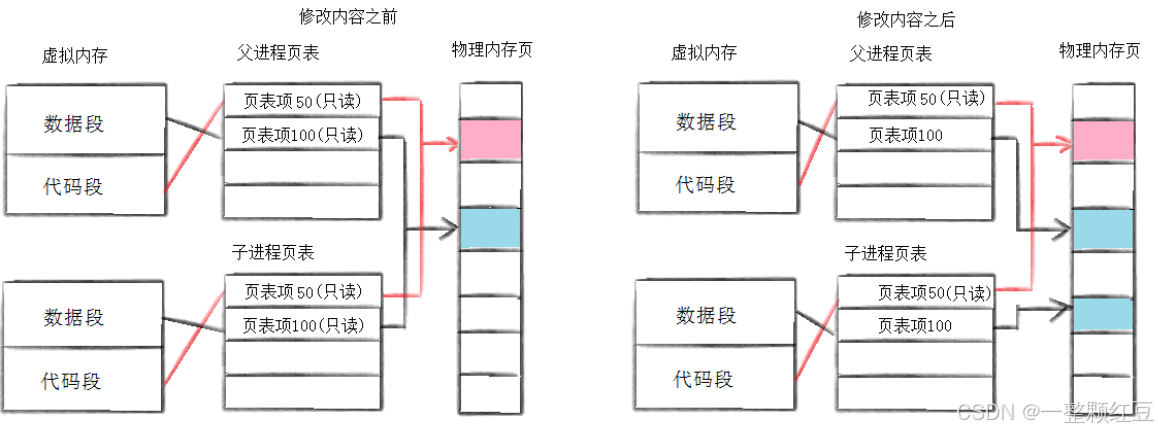 EAGAIN:进程数超过限制(RLIMIT_NPROC)或内存不足。ENOMEM:内核无法分配必要数据结构所需内存。Copy-On-Write写时拷贝(COW)是 Linux 中 fork() 系统调用的核心优化机制,它使得进程创建变得高效且资源友好,通常,父子代码共享,父子再不写入时,数据也是共享的,当任意一方试图写入,便以写时拷贝的方式各自⼀份副本。