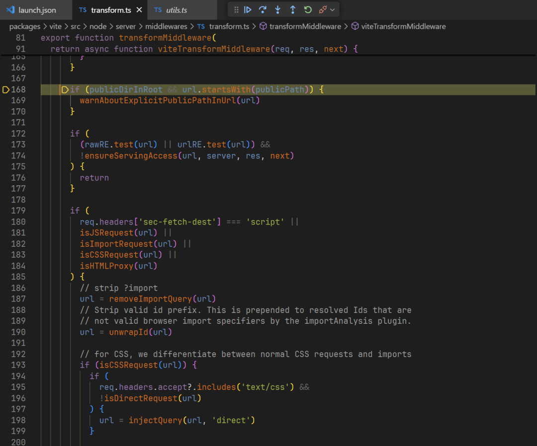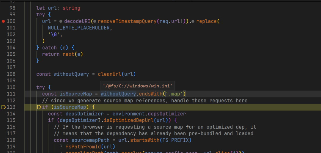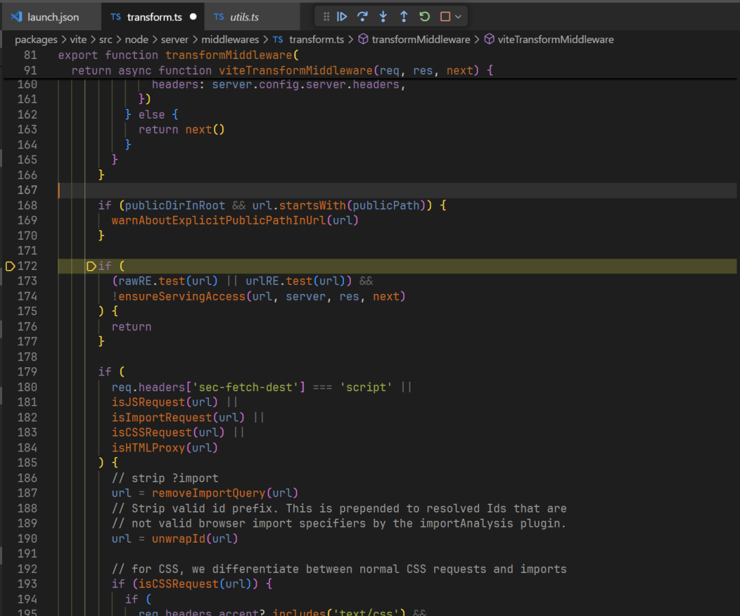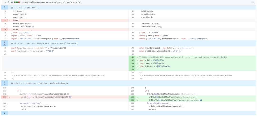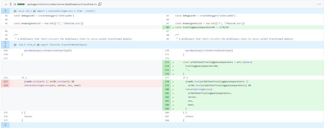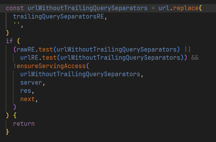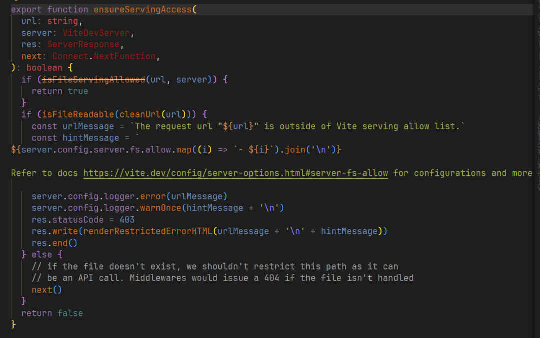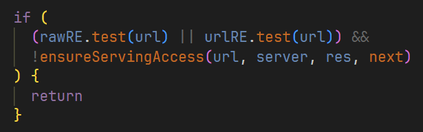 会先判断(rawRE.test(url) || urlRE.test(url))当满足rawRE.test(url)=false并且urlRE.test(url)=false时则跳过ensureServingAccess函数,该函数则为vite服务器的一个安全函数用于检查请求的 URL 是否允许被 Vite 服务访问