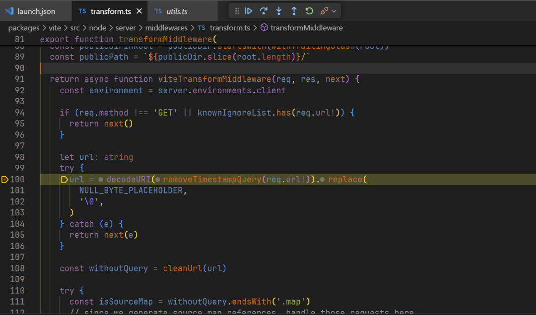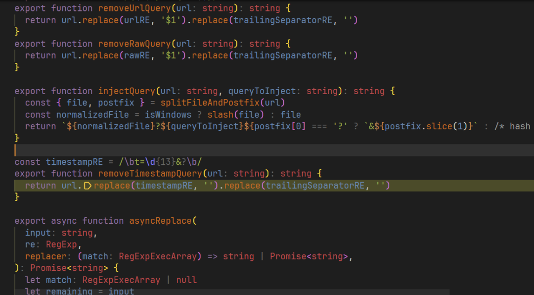 根据修复代码定位到packages\vite\src\node\server\middlewares\transform.ts,在URL出打下断点,跳入到removeTimestampQuery方法中