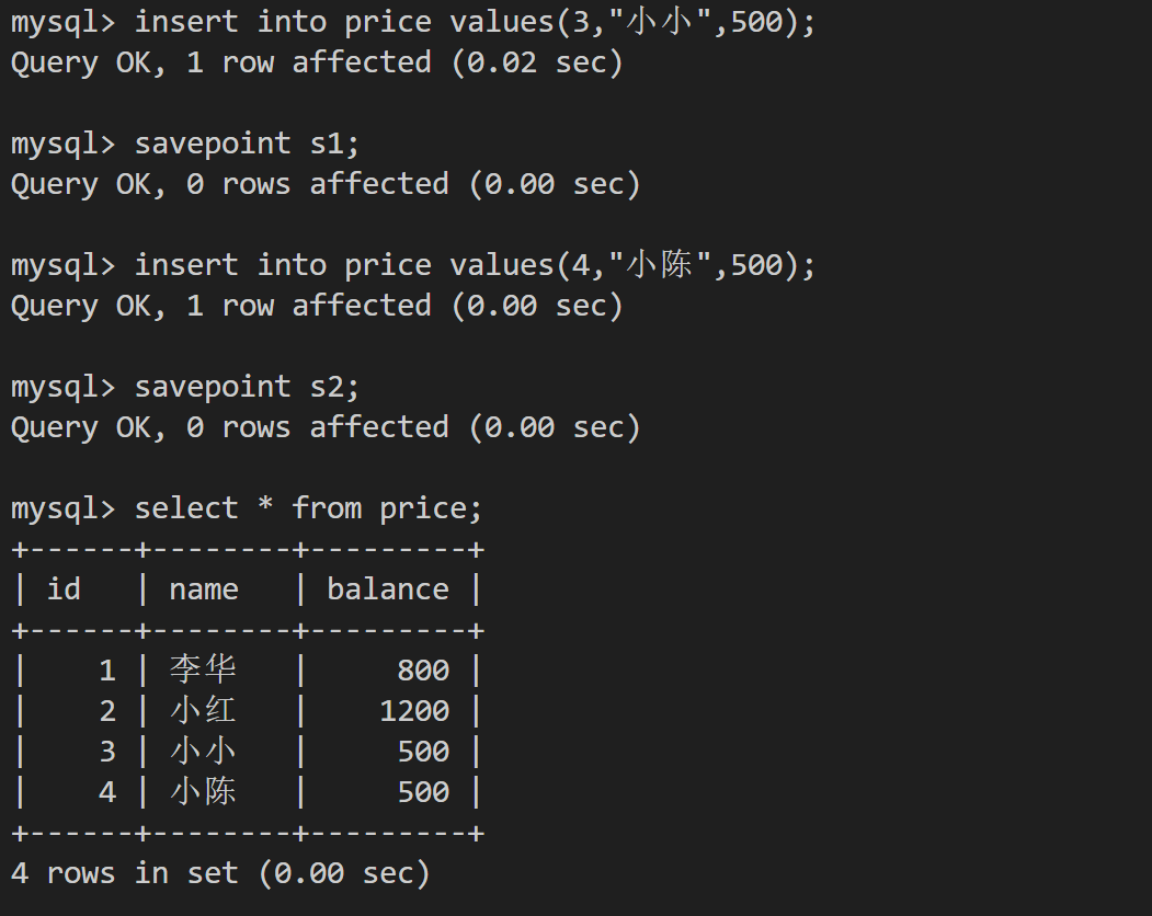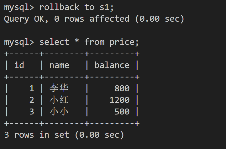 开启事务后,可以通过设置保存点决定回滚到哪一次保存前的内容