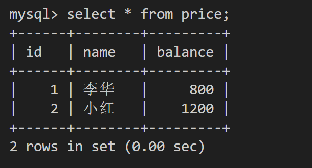 事务回滚,重新查看price表,发现刚才的元组没了;