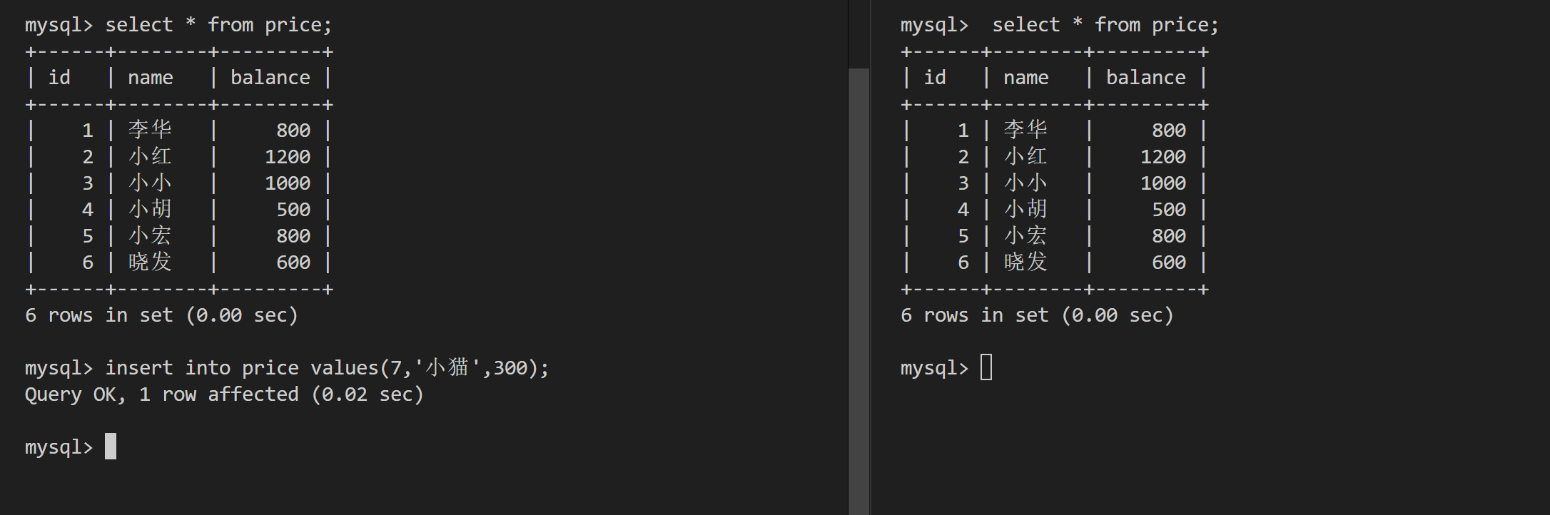 我插入在左边的客户端向表中插入了一行数据,但是不commit;我们发现右边查不到新的数据,这是因为左边的事务没有提交,一个SQL语句已经不再是一个完整的事务了。