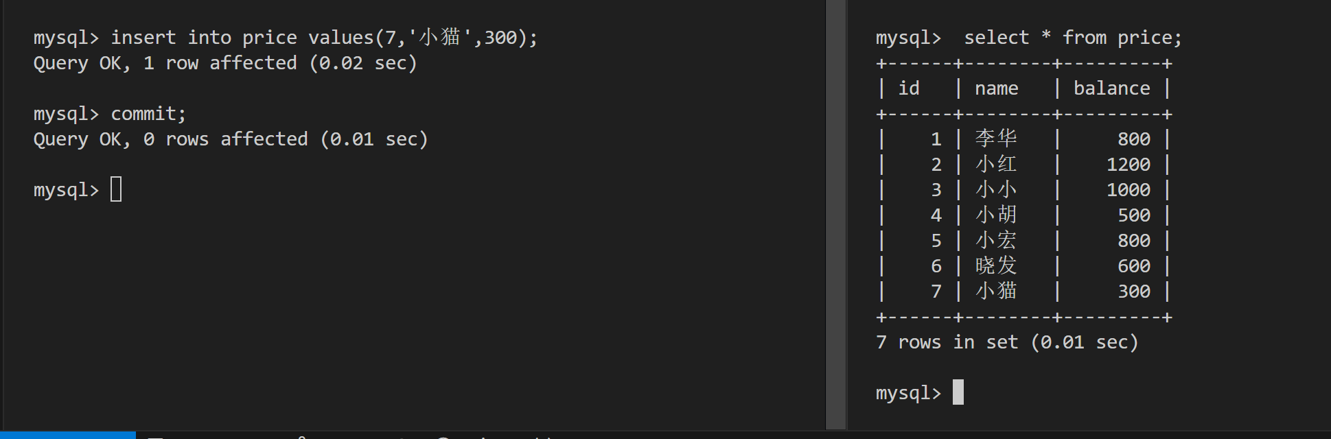 下面把左边的事务提交了试试看,发现左边的事务提交了之后,右边才可以看到新的数据行;
