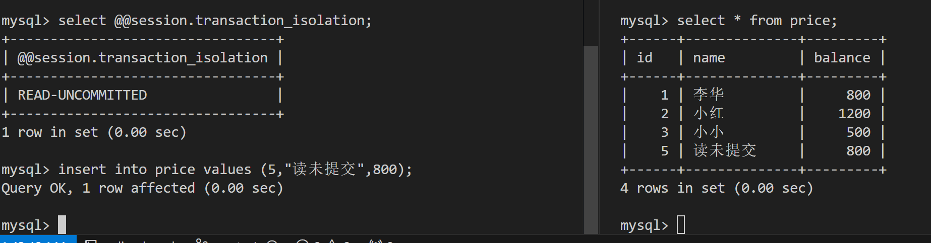 开启事务,向price表中插入一行数据,但不提交,再打开一个客户端,查看price表,发现新增了一条数据,