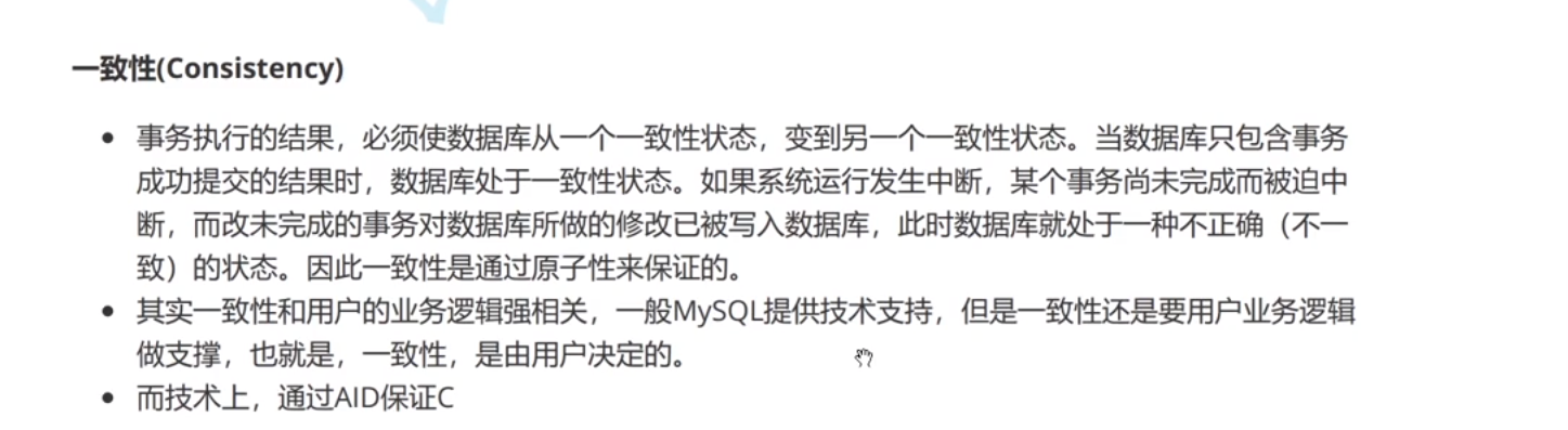 一致性算是一种目的和要求,通过前面的原子性,隔离性,持久性来保证事务的一致性;