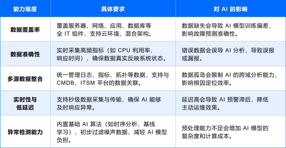 监控工具是 AI 获取运维数据的基础,需满足以下条件: