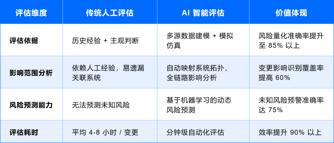 传统的变更风险评估通常在变更实施前进行,是一种静态的评估方式。而引入 AI 技术后,变更评估将转变为动态实时评估。在变更实施过程中和实施后,AI 持续收集和分析系统数据,实时调整风险评估结果,确保对变更的风险和影响有全面、及时地了解。这种动态评估方式能够更好地应对复杂多变的 IT 环境,及时发现并解决变更过程中出现的问题。