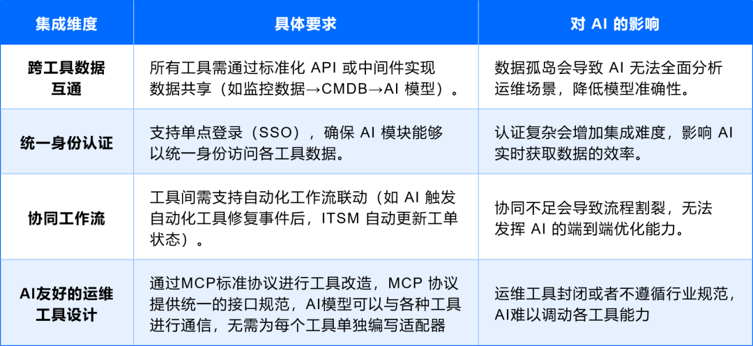 自动化工具是 AI 执行运维操作的 “执行者”,需满足以下条件: