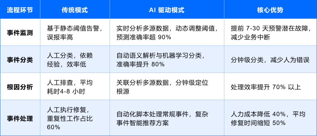 AI 的应用使得事件管理流程中的各个环节,从事件监测、分类、分派到处理和修复,都实现了不同程度的自动化。自动化流程不仅提高了处理效率和准确性,还减少了人为错误的发生。运维人员从繁琐的重复性工作中解放出来,能够将更多的时间和精力投入处理复杂问题和优化运维策略上。未来,随着 AI 技术的不断发展,事件管理流程的自动化程度将进一步提高,甚至可能实现大部分事件的无人值守处理。