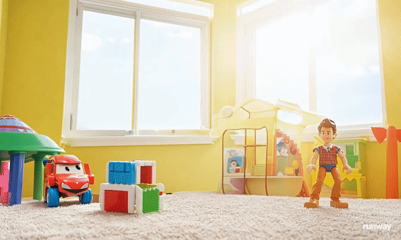 3.高角度镜头,明亮的正午阳光,一群充满活力的玩具复活,皮克斯风格,在一个孩子色彩缤纷的卧室里,玩具车和动作人物四处移动,氛围愉快且充满活力。