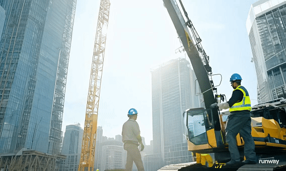 2. 中景镜头,刺眼的正午阳光,施工现场的工人们穿着安全装备操作起重机,背景中耸立着摩天大楼,氛围动态而繁忙。