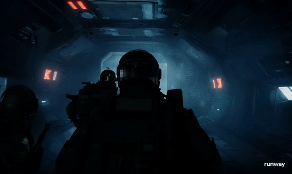 3.跟踪镜头,昏暗的走廊,一群太空海军陆战队小心翼翼地穿过废弃的飞船,灯光闪烁和诡异的声音,氛围紧张且悬疑。