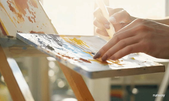 5.极限特写镜头,自然光线,一位画家的手在调色板上混合颜色,背景是画布和画架,手指上沾有颜料,氛围专注而富有创造力。